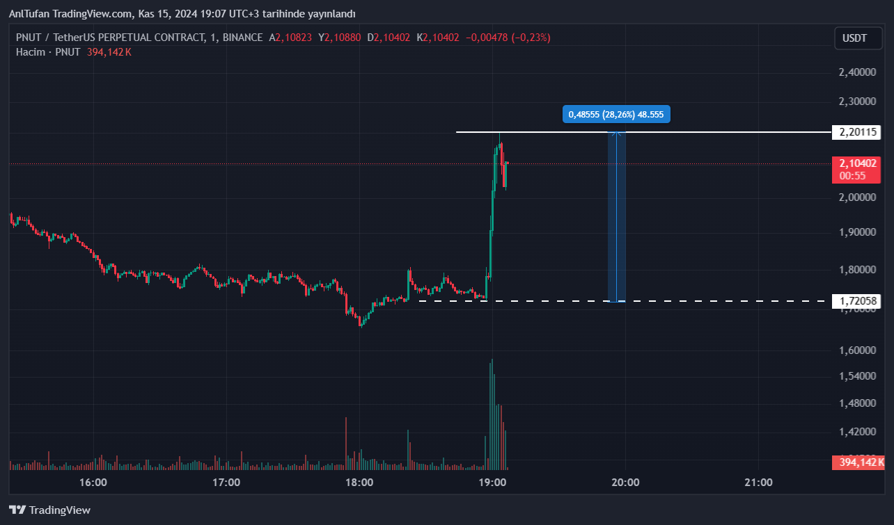 Oluşan hype ve yaşanan yükselişlerle birlikte Binance’de de listelenen PNUT isimli memecoin, Elon Musk’ın paylaşımı ile birlikte %25’lik ani bir yükseliş gerçekleştirdi.