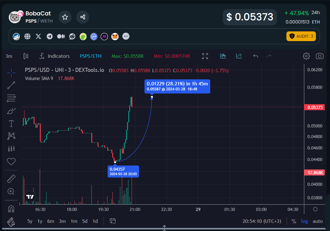 Okurlarımızın PSPS isimli meme coin’in 24 saatlik hacminin sadece 1 milyon dolar değerinde olduğunu unutmaması gerekiyor. Önümüzdeki dakikalarda bu meme coin aşağı veya yukarı yönlü çok daha sert hareketler sergileyebilir.