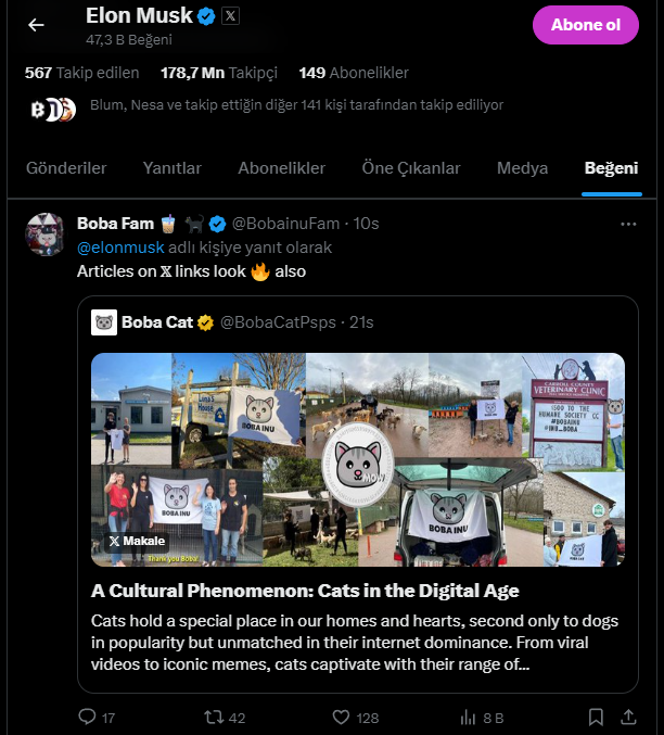 Elon Musk X/Twitter’a eklenen premium makale görünümünün övüldüğü bir paylaşımı beğense de, bu makalenin ana odağının BobaCat olması dikkat çekti.