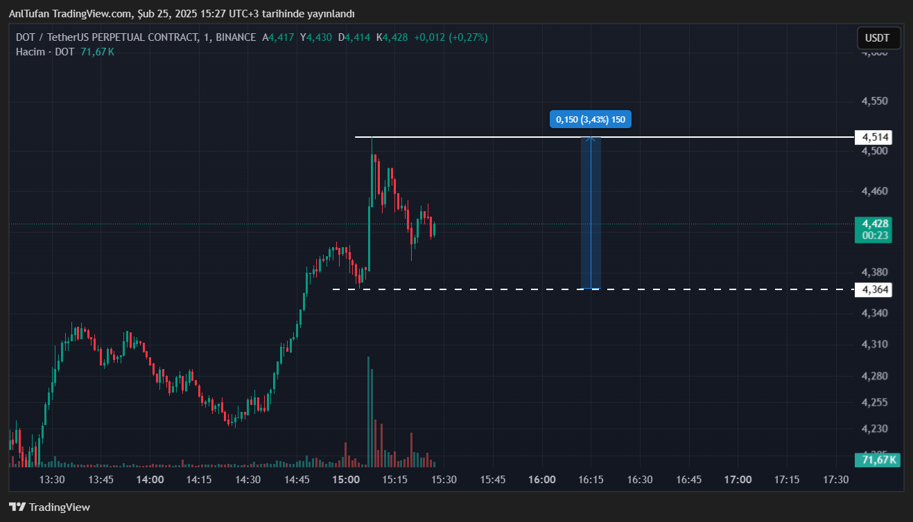 Son gelen başvuru haberi ile birlikte Polkadot (DOT) fiyatında %4’lere yaklaşan bir sıçrama yaşandı. İlerleyen dönemde SEC’in spot DOT ETF’lerini onaylaması, major altcoin’in dev yükselişler gerçekleştirmesini sağlayabilir.