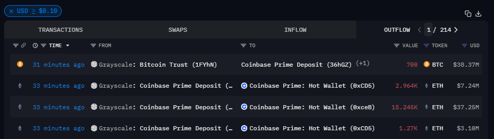 Coinbase Prime’e Bitcoin (BTC) ve Ethereum (ETH) aktaran Grayscale, varlıkları tasfiye etmeye devam ediyor. Grayscale’in bir süre daha bu transferlere devam etmesi bekleniyor.