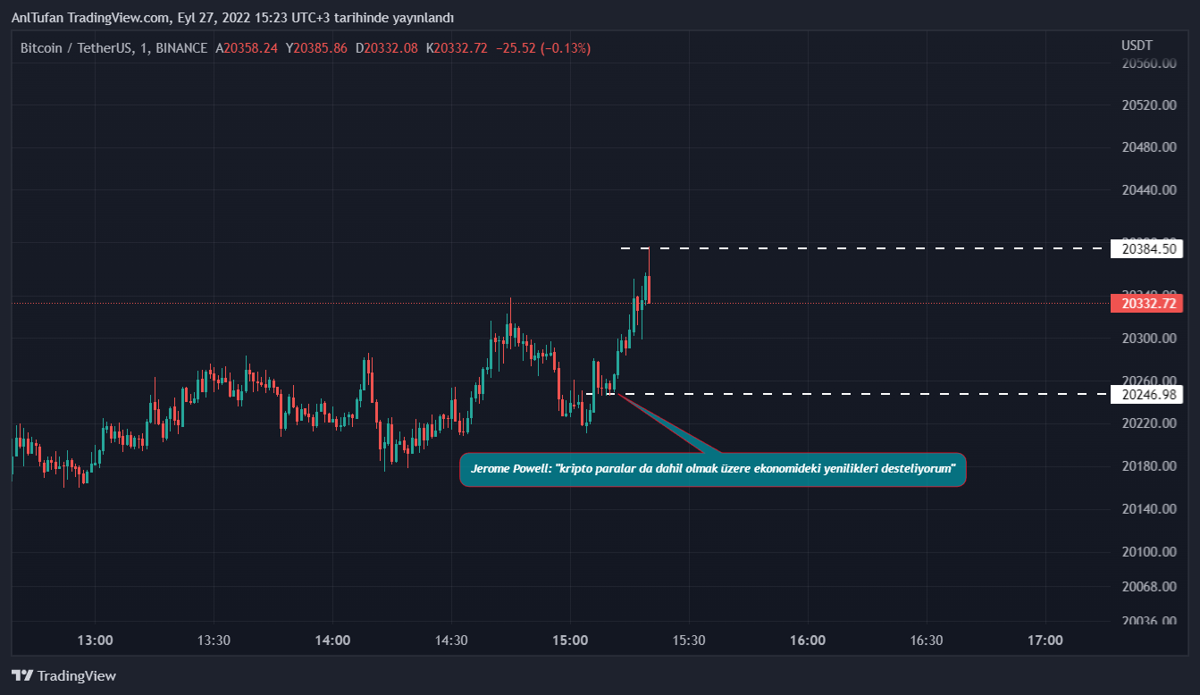 Bu söylemin ardından sonra ise lider kripto para birimi Bitcoin, yukarı yönlü bir tepki verdiği görülüyor. Her ne kadar BTC’deki yükseliş çok sert olmasa da, Powell uzun bir süre sonra ilk kez Bitcoin’in değer kazanmasını sağladı.