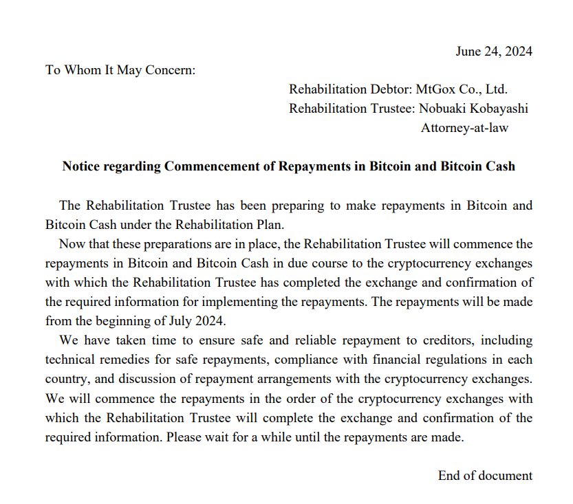 Mt.Gox mütevelli heyetinin paylaştığı dökümanlarda, Mt.Gox’un BTC ve BCH ödemelerini 2024 Temmuz ayında başlatacağı görülüyor. İşte resmi belgelerde yer alan önemli bilgiler: