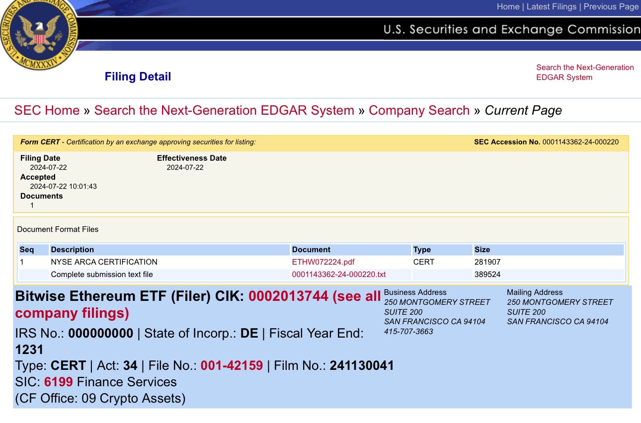 Kısa bir süre önce gelen bilgilere göre New York Menkul Kıymetler Borsası (NYSE), Bitwise spot Ethereum (ETH) ETF’inin listelenmesini onayladı. NYSE, Bitwise onayından dakikalar sonra Grayscale spot ETH ETF’sini de onayladığını paylaştı.