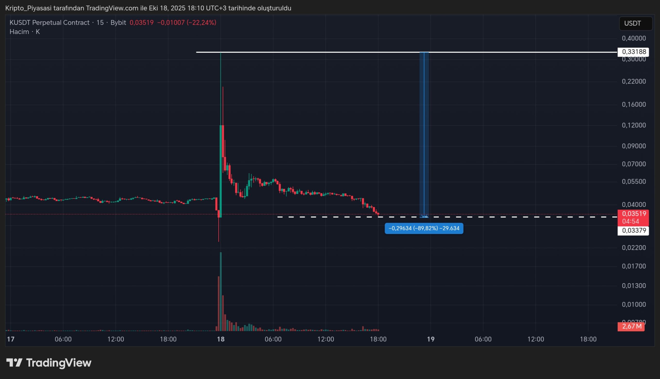 Kısa bir süre önce K fiyatında 15 dakika içerisinde %400’lük bir sıçrama yaşandı. Bu sıçrama sonrasında ise yapılan satışlar ile birlikte K fiyatında -%90’lık çöküş meydana geldi. Az önce ise Bybit borsası muhtemelen piyasa manipülasyonu şüphesiyle K’yı vadeliden delist edeceğini paylaştı.