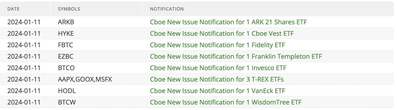 Chicago Opsiyon Borsası (CBOE) resmi internet sitesi üzerinde yarın ETF’lerin işleme gireceğinin paylaşıldığı görülüyor. Yine de okurlarımızın herhangi bir işlem almak için resmi SEC duyurusunu beklemeleri daha doğru olacaktır.
