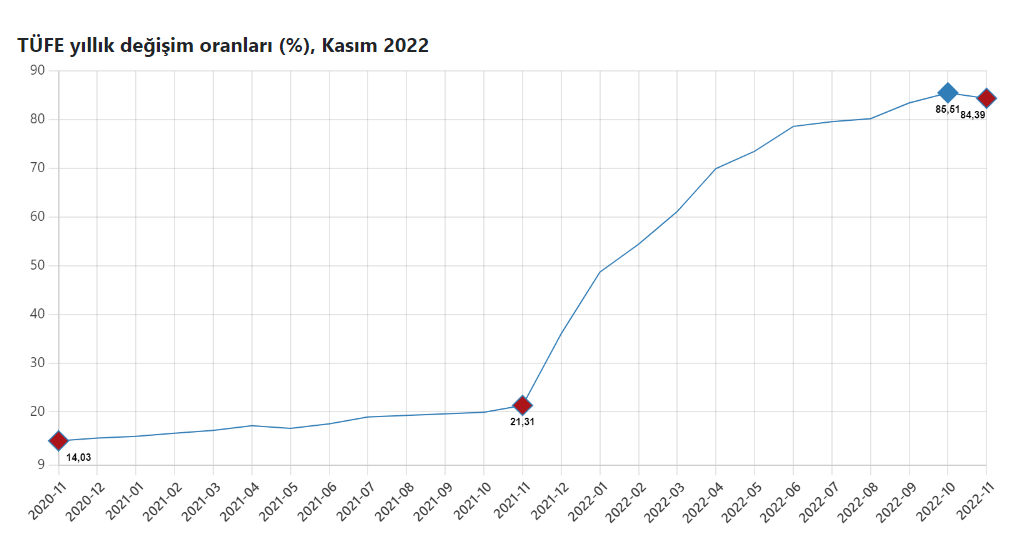 Yıllık enflasyon oranlarına baktığımızda ise 1.5 yıl sonra bir ilkin yaşandığı görülüyor. Enflasyon oranı yüzde 85.51’den yüzde 84.39’a gerilemiş durumda.