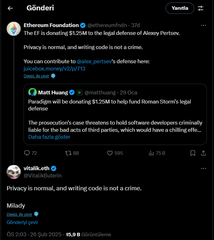 Ethereum Vakfı resmi X/Twitter hesabı üzerinden paylaşımında bağış söyleminin yanı sıra “Gizlilik normaldir ve kod yazmak suç değildir.” sözlerine de yer verdiği gözlemlendi.