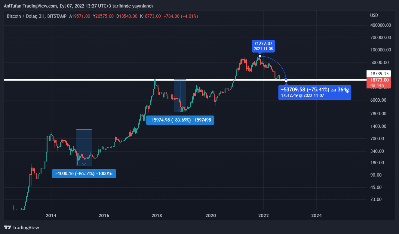 2017 yılındaki boğa sezonunda yüzde 14 bin oranında yükseliş yaşayan BTC, 2021 yılındaki boğa döngüsünde ise yüzde 2 bin oranında değer kazandı. Bu 2 yükseliş serüvenlerini kıyasladığımızda dahi aynı düşüş yüzdesini beklemek abes kaçıyor.
