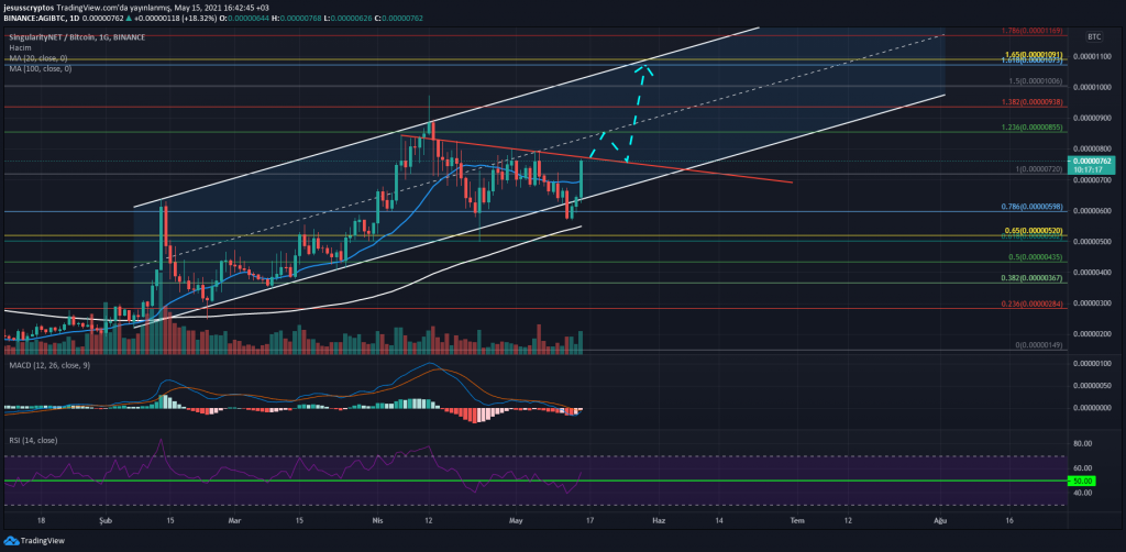 Binance üzerinde henüz Tether (USDT) paritesi bulunmayan ve 766 Satoshi’den alıcı bulan AGI, günlük grafik üzerinde altında kaldığı yükselen kanala yeniden dönmüşe benziyor. Bu kanal içinde ayrıca kırmızı düşüş trendiyle karşı karşıya kalan AGI, MA20 seviyesi olan 695 Satoshi üzerindeki mum kapanışıyla bu düşüş trendini kırabilir.
