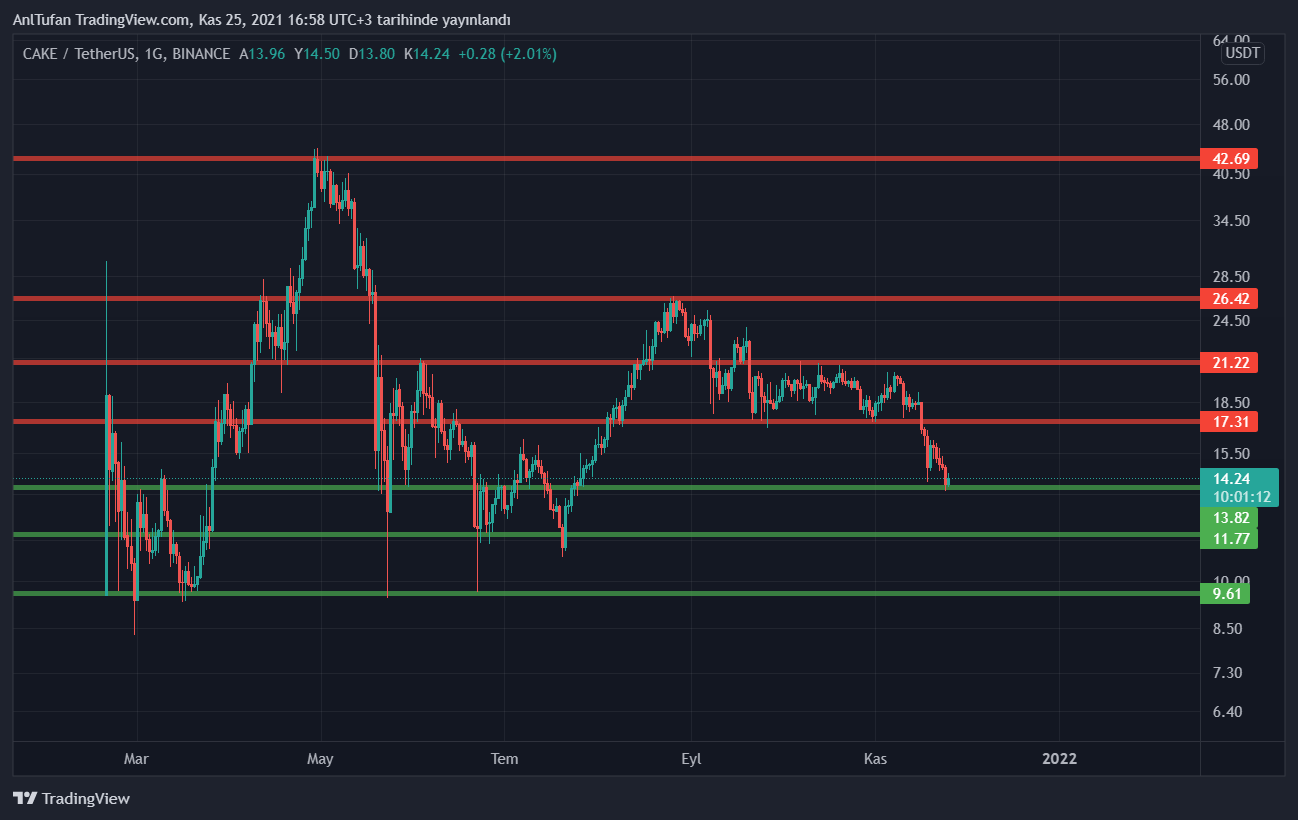 Bitcoin tekrardan yukarı doğru hareketine başladığı takdirde, CAKE’te sert yükselişler yapabilir. 17.31 dolar ve 21.22 dolar da önemli direnç seviyeleri bulunan CAKE’in bu seviyelerin kırılımıyla birlikte hızlıca 26.42 dolar ve 42.69 dolar seviyelerine yükseleceği düşünülüyor.