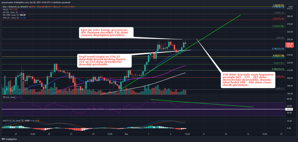 Son olarak yükseliş tarafına baktığımızda SOL fiyatının 250 dolar direncini geçmesi, nihai hedef olarak 290 – 300 dolar hedefine işaret ediyor. Orta vadeli bir hedef olan bu aralığa yükselirken 265 – 275 ve 283 dolar seviyelerinin ara dirençler olması bekleniyor.