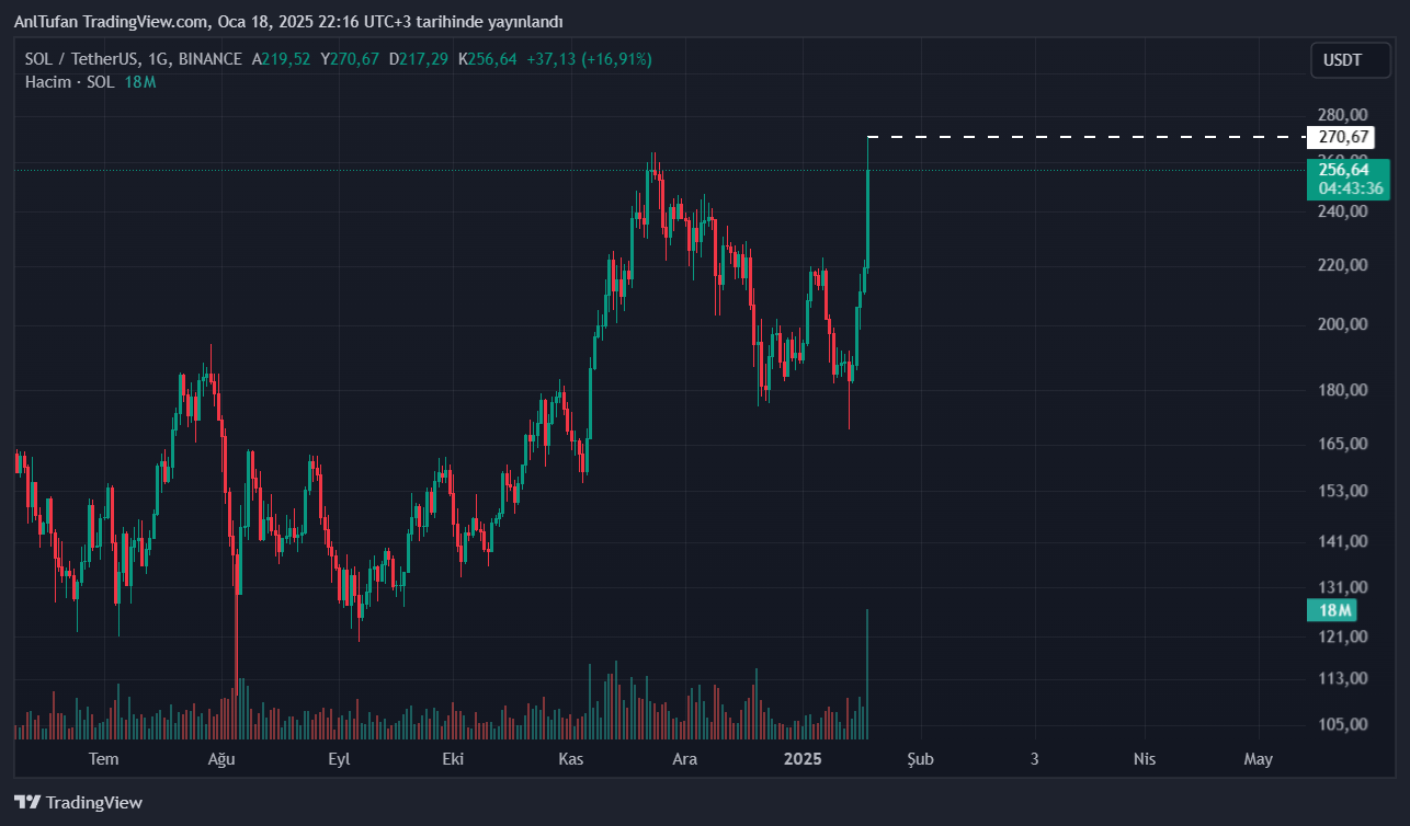 Solana (SOL) bugün özelinde %25’lik bir yükseliş yaşayarak 264 dolarlık ATH zirvesini kırdı ve 270 doları gördü. An itibariyle ise SOL bu yükselişlerin bir kısmını kaybetti ve 255 dolardan işlem görüyor.
