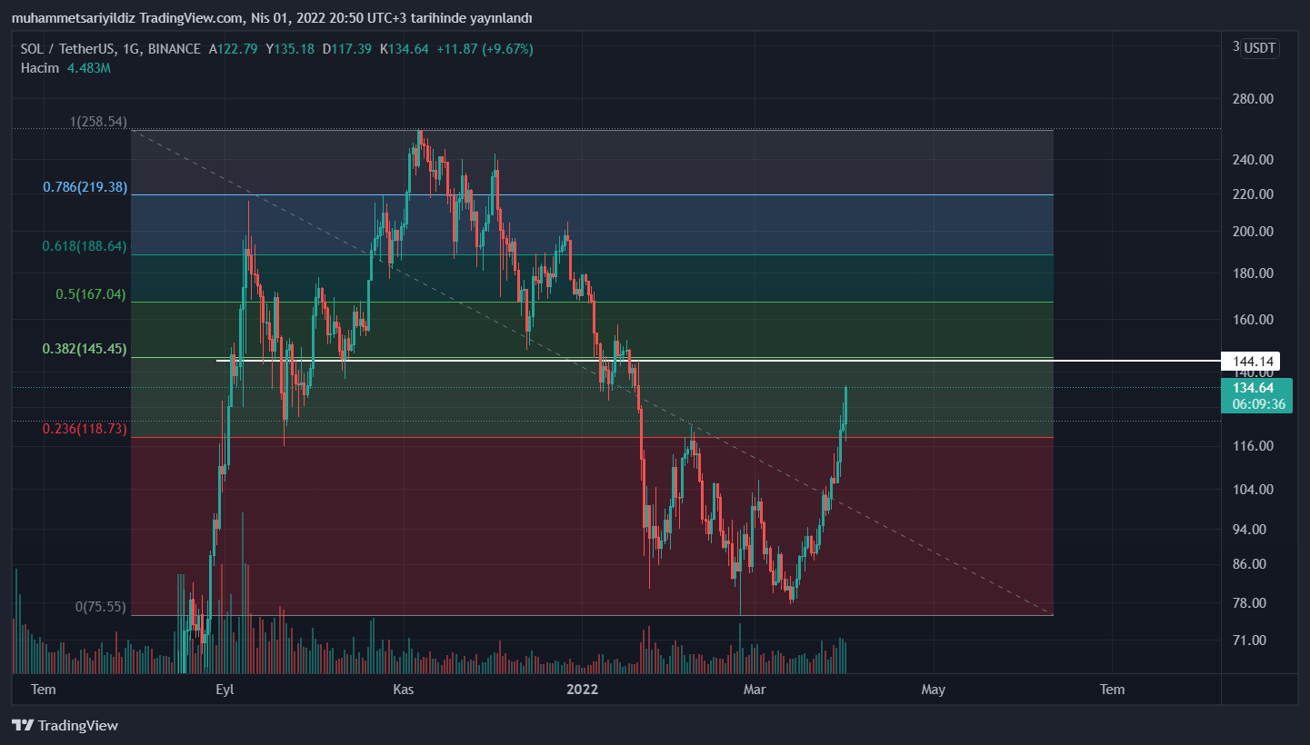 İlerleyen saatlerde fibonacci 0.382 seviyesi olan 145 dolara kadar yükselmesi çok muhtemel gözüken Solana, bu direnç noktasını kırmasının ardından ise çok daha sert değer kazanabilir gibi duruyor.