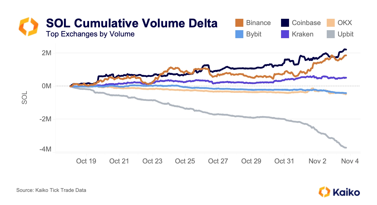 Solana’daki ralli, 18 Ekim’den bu yana net 2,2 milyon token satın alınan Coinbase tarafından yönetiliyor. Binance, Kasım ayının başına kadar Coinbase’i takip etti.