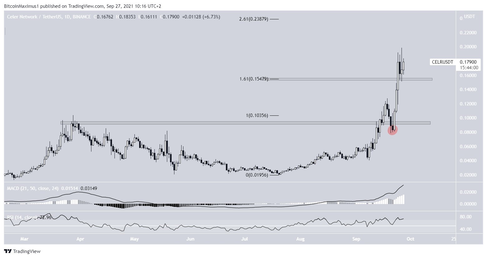 CELR, 15 Eylül’deki 0,093 dolarlık direnç alanından çıkışından bu yana yükseliyor. 21 Eylül’de kırmızıyla belirtilen alanın altına bir sarkma yapan CELR, sonrasında hızlı bir şekilde toparlanma yaparak yatırımcılarını memnun etti.
