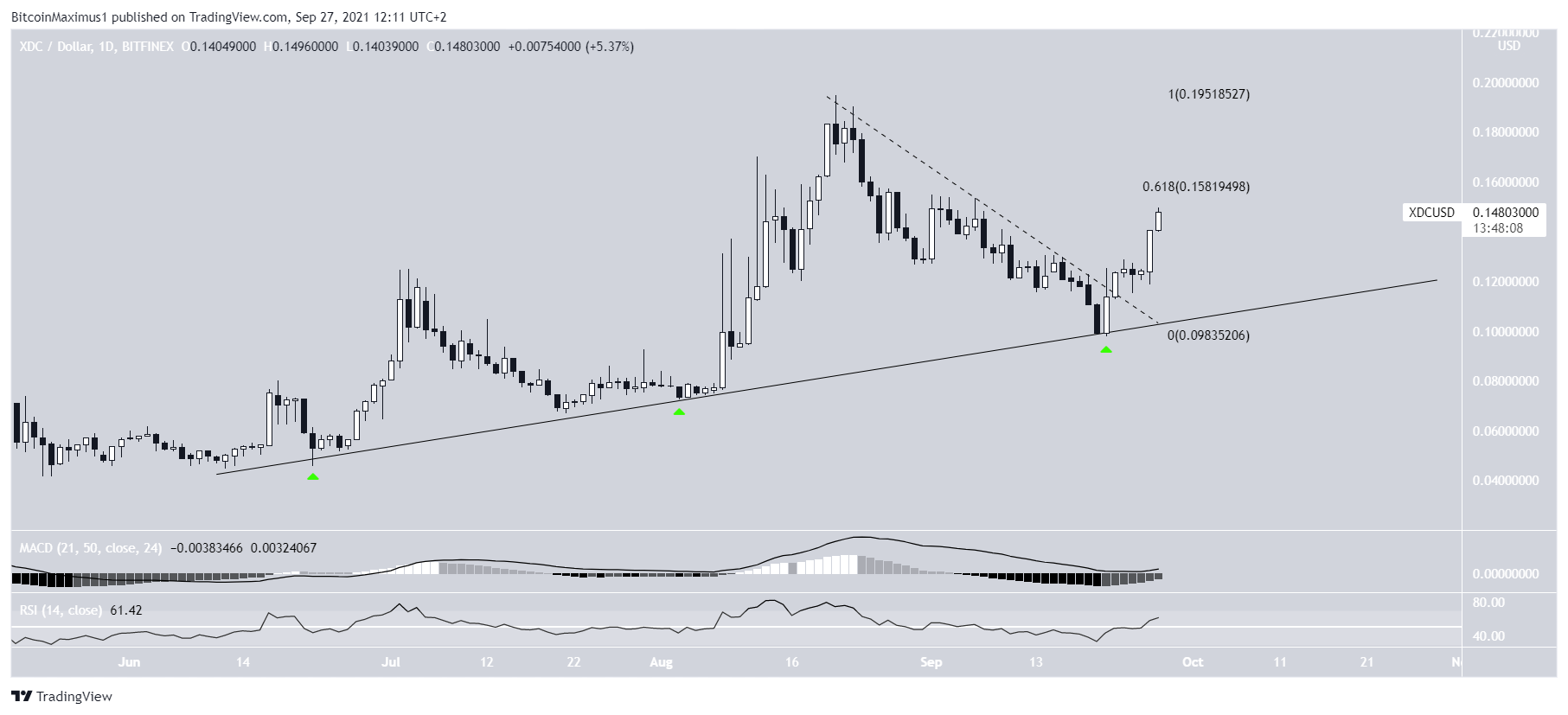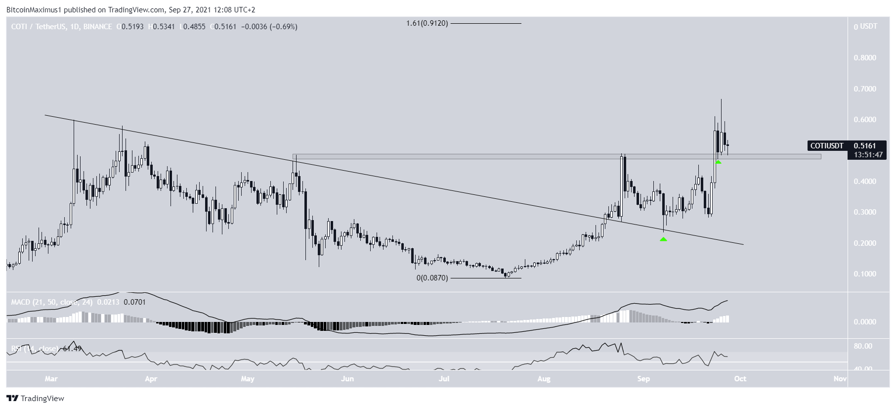 COTI, alçalan bir direnç çizgisinden kurtuldu ve 7 Eylül’de yeşil olarak belirtilen bölgeyi kendine destek olarak aldığından bu yana sürekli olarak artıyor. Bu seviyelerden sonra yukarı hareketine devam etti ve 25 Eylül’de tüm zamanların en yüksek seviyesi olan 0,66 dolara ulaştı.