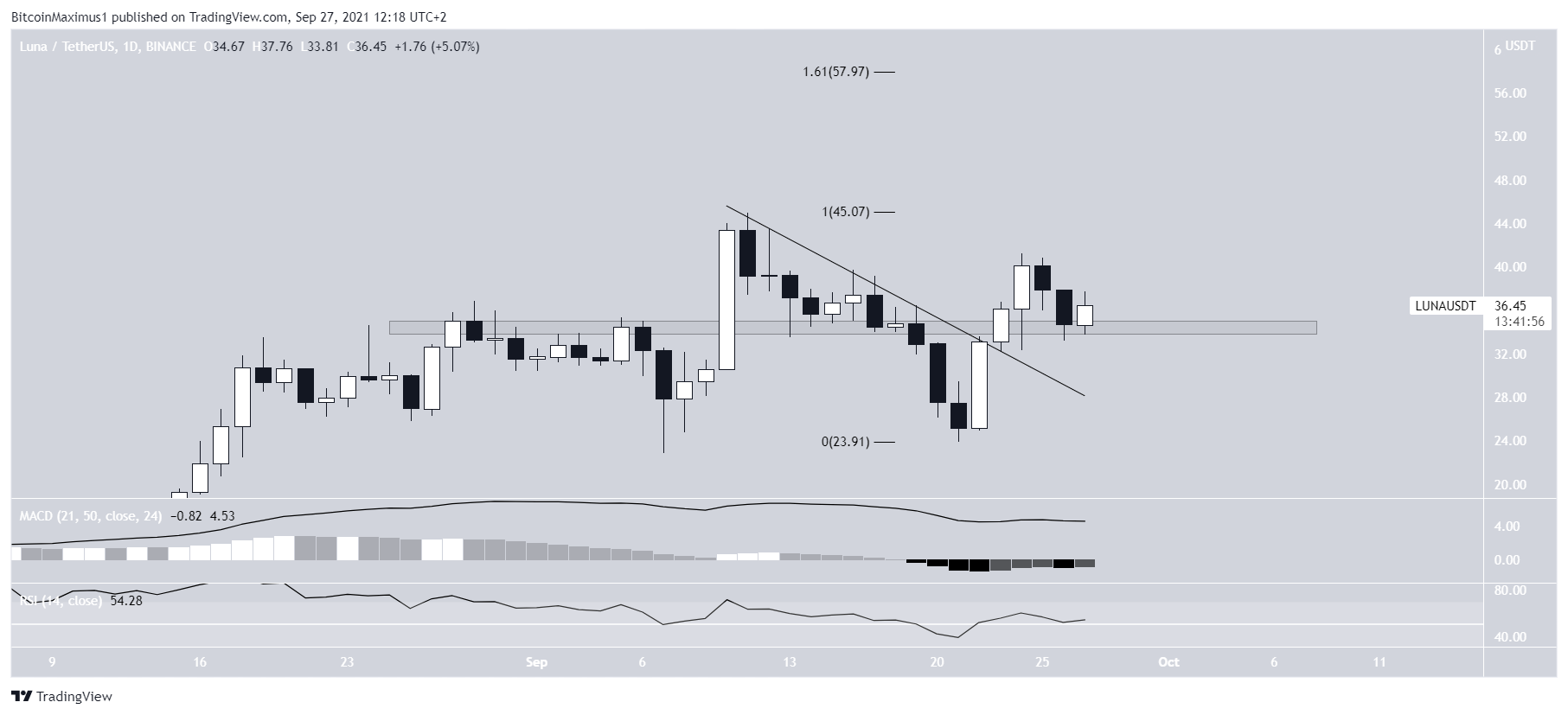 LUNA, tüm zamanların en yüksek fiyatı olan 45 dolara 11 Eylül tarihinde ulaştı. Yeni ATH’den bu yana azalan bir direnç çizgisi oluşturmaya devam ediyor. Bu seviye 21 Eylül tarihinde 23.95 dolara kadar düştü.