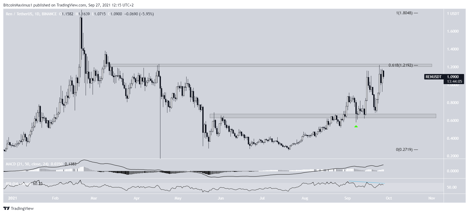 REN, 0,62 dolar direnç alanından kurutuldu ve bu seviyeyi destek olarak kazandıktan sonra yeşil renkle işaretlenen bölgeden yukarı doğru hareket ediyor.