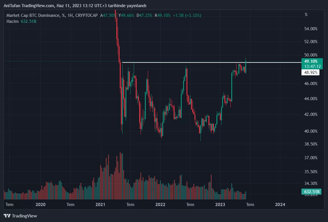 2023 yılı itibariyle fazlasıyla bullish hareketler sergileyen BTC dominans tablosu, altcoin’lerin zorlu günler geçirmesine neden oluyor. BTC dominans tablosu şuan yeni bir yükselişe hazırlanıyor olabilir.