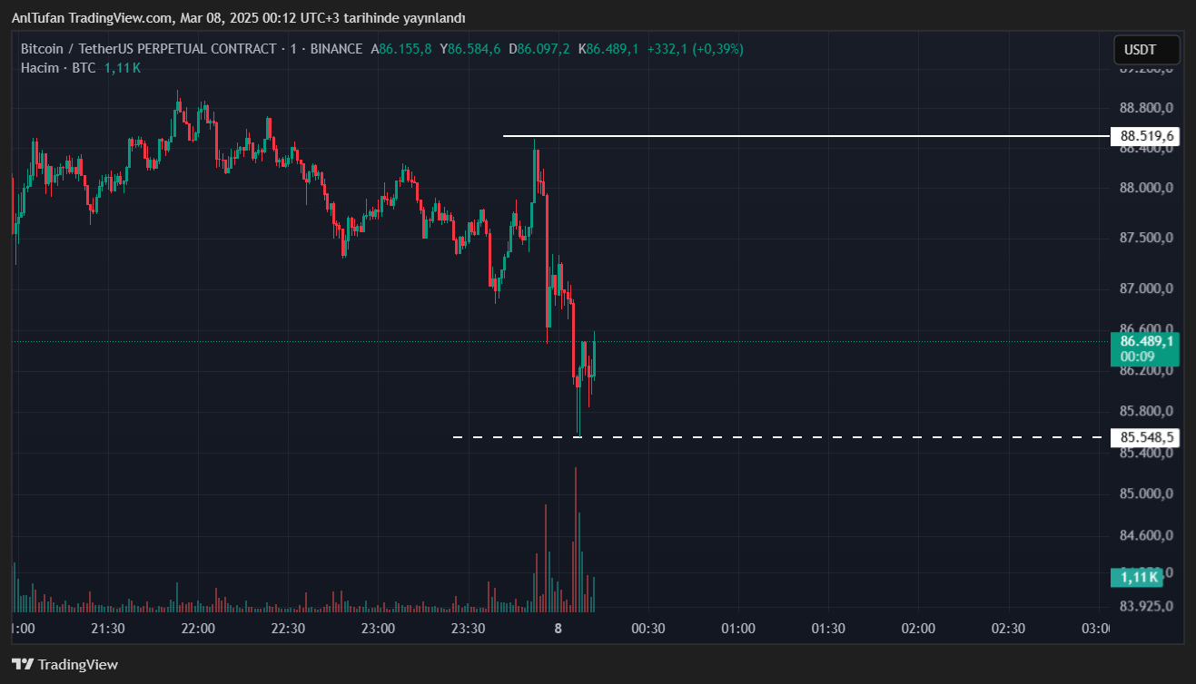 Şuan itibariyle kripto piyasasındaki dalgalı seyir devam ediyor. İlerleyen saatlerde Bitcoin’in (BTC) 85 bin dolar desteğinin altına sarkması ise piyasada çok daha büyük düşüşlerin yaşanmasına yol açabilir.