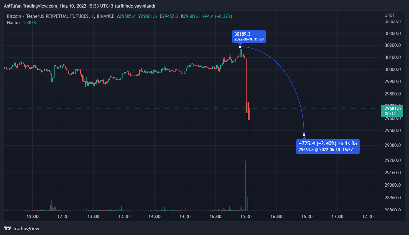 Dakikalar içerisinde 29.450 dolar seviyelerine kadar değer kaybeden BTC, ilerleyen saatlerde ise düşüşe devam edebilir gibi gözüküyor.