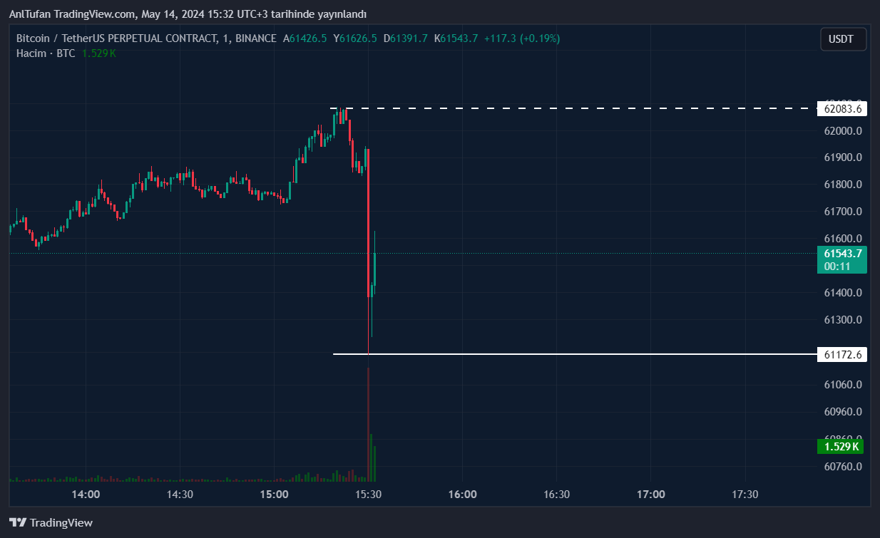 Binance vadeli piyasada 62 bin dolar seviyelerinden 61.100 dolara kadar gerileyen BTC, dakikaların ilerlemesiyle yeniden kademe kademe toparlanmaya başladı.