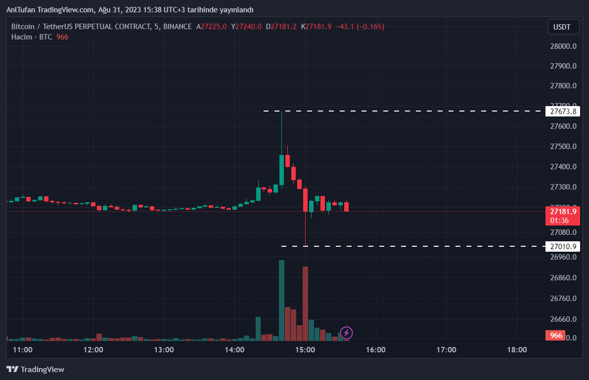 Lider kripto para birimi Bitcoin’de (BTC) bu veriler öncesinde bir “pump and dump” operasyonu gerçekleşti. 27.600 dolara yükselen BTC, kısa bir süre içerisinde 27 bin dolara geriledi.
