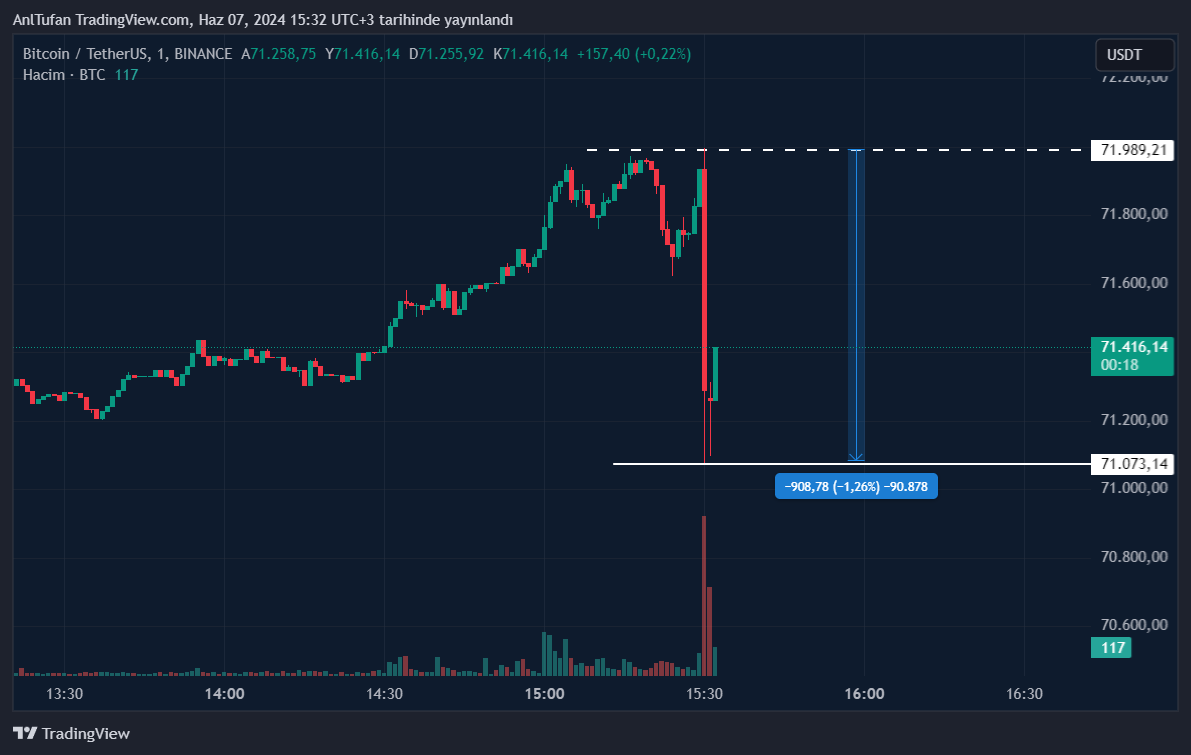 Veri öncesinde Binance vadeli piyasada 71.989 dolara iğne atan BTC, veri ile birlikte 71 bin dolar seviyelerine kadar %1.25’lik bir düşüş yaşadı.