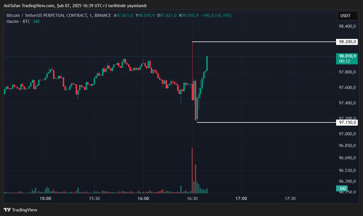 Verilerin ilk geldiği anda 98.200 dolara kadar yükselen Bitcoin, sonrasında 97.150 dolara kadar geriledi. BTC‘nin an itibariyle ise tekrardan toparlandığı ve yükselişe geçtiği görülüyor.