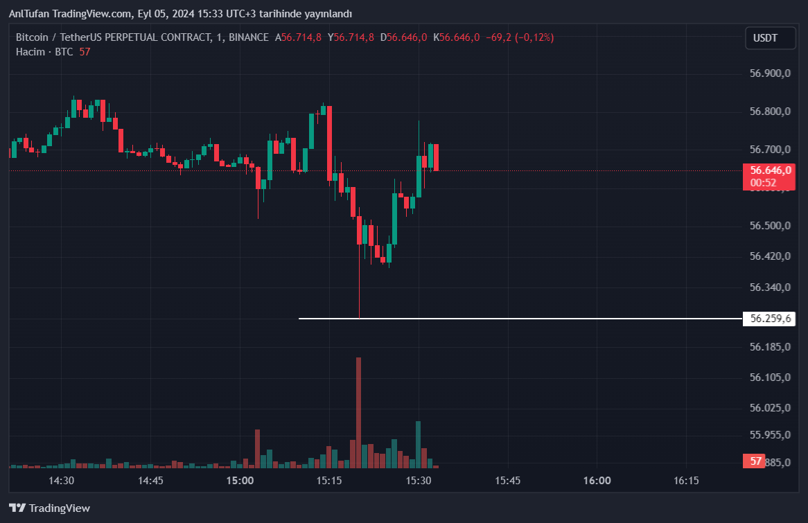 Bu son gelen veriler ile birlikte lider kripto para birimi Bitcoin‘de (BTC) oynaklığın arttığı görüldü. TSİ 15.15’de açıklanan ilk veri sonrasında BTC 56.259 dolara kadar iğne atsa da, sonrasında toparlanmayı başardı.