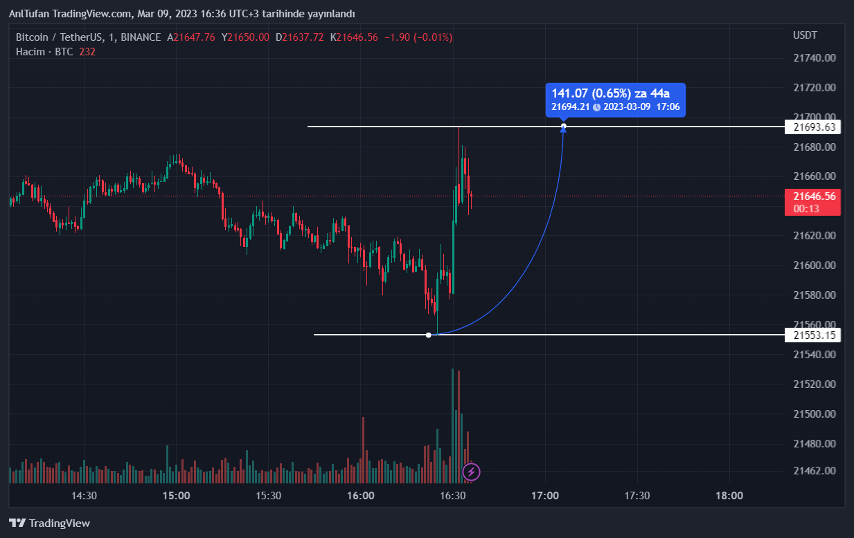 Bu güzel veri sonrasında anlık bir tepki ile 21.550 dolar seviyelerinden 21.700 dolara ulaşan Bitcoin (BTC), şuan itibariyle tekrardan geri çekilmeye başlamış gibi duruyor.