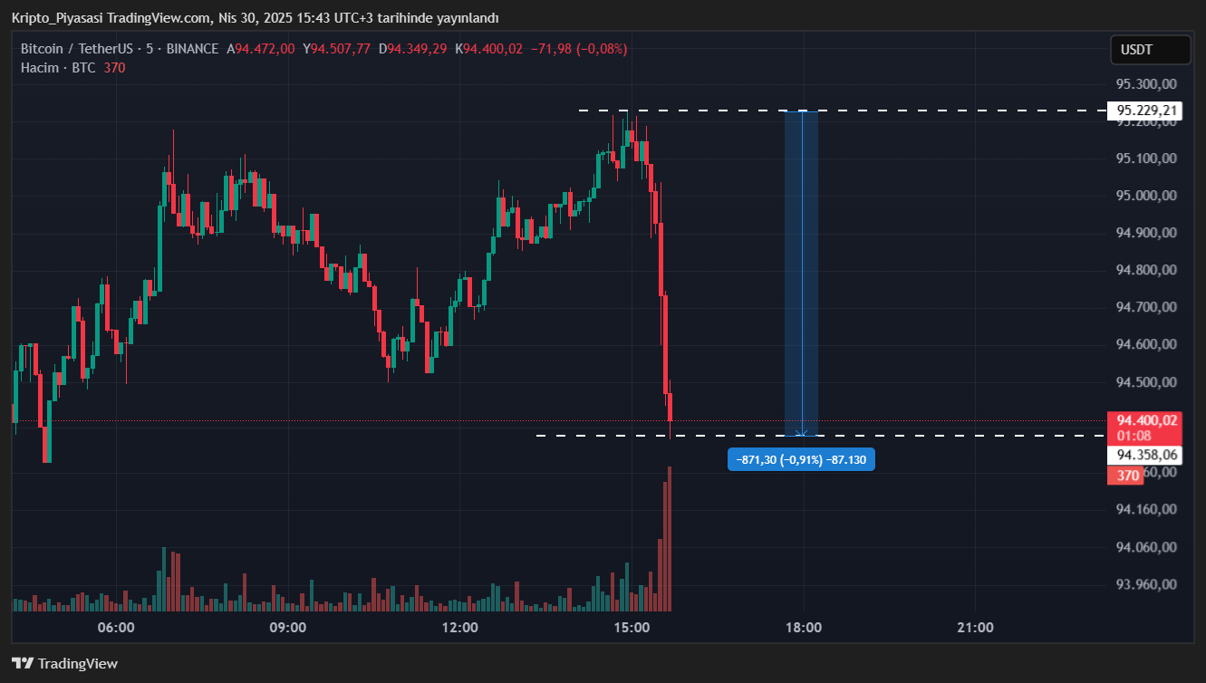 Bu son açıklanan veriler lider kripto para birimi Bitcoin’i (BTC) kötü etkiledi. BTC son dakikalarda %1’lik bir düşüş yaşayarak 94.350 dolara geriledi.