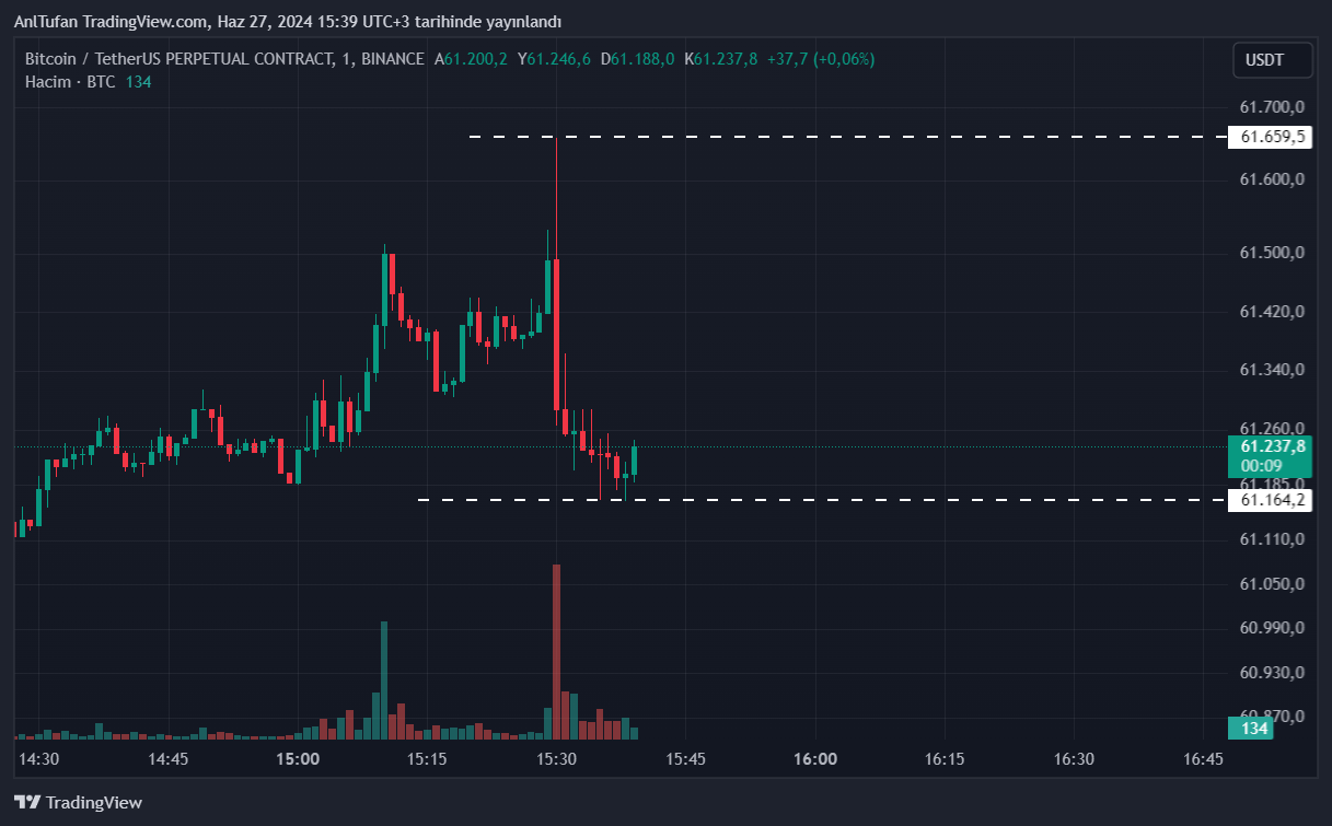 Lider kripto para birimi Bitcoin (BTC) Binance vadeli piyasada ABD verilerinin ilk açıldığı an her ne kadar 61.650 dolara kadar iğne atsa da, verilerin kısmı olumsuz olması nedeniyle saniyeler içerisinde 61.164 dolara kadar geriledi.