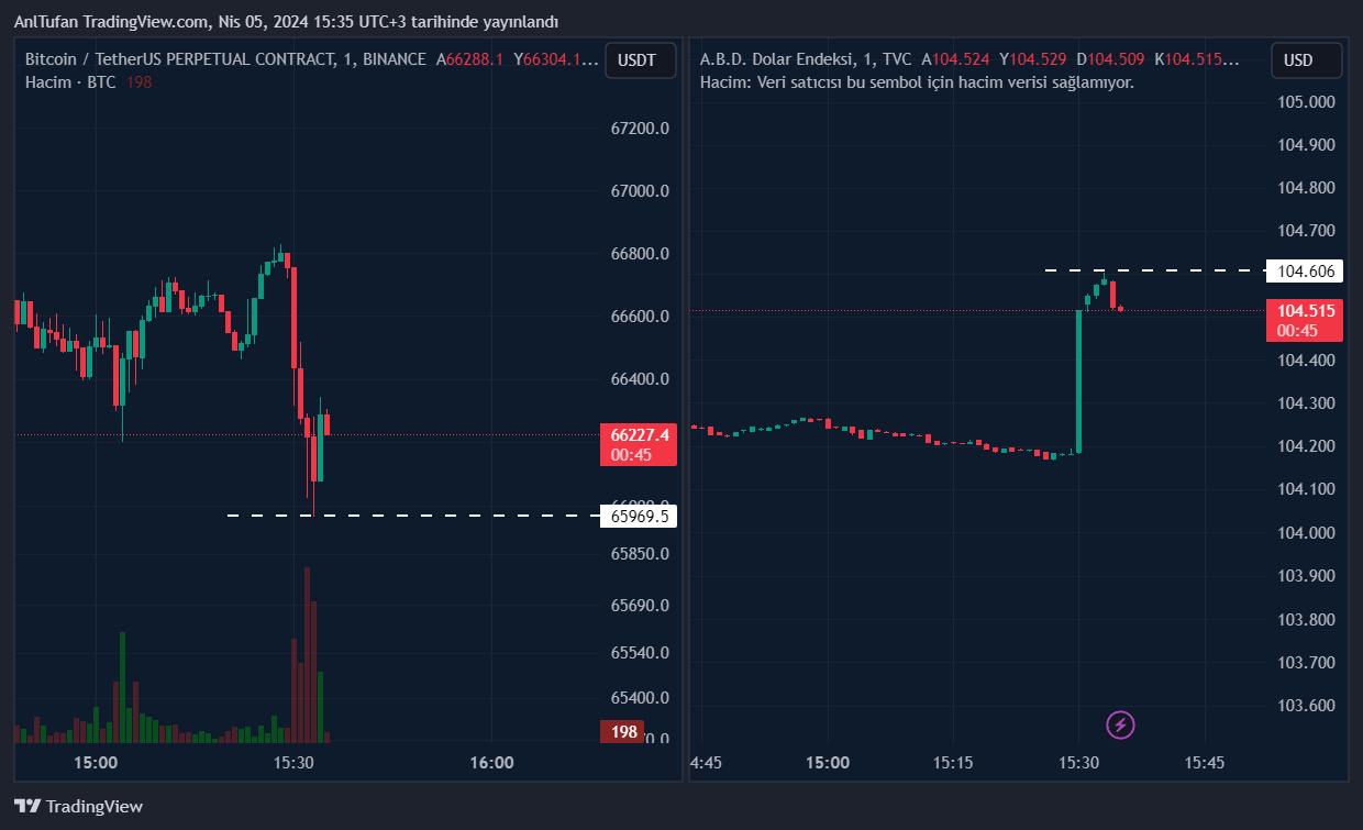 Olumsuz gelen ABD ekonomi verileri sonrasında Bitcoin 65.969 dolar seviyelerine kadar gerilerken, ABD dolar endeksinin (DXY) ise 104.6 seviyesine yükseldiği görüldü.