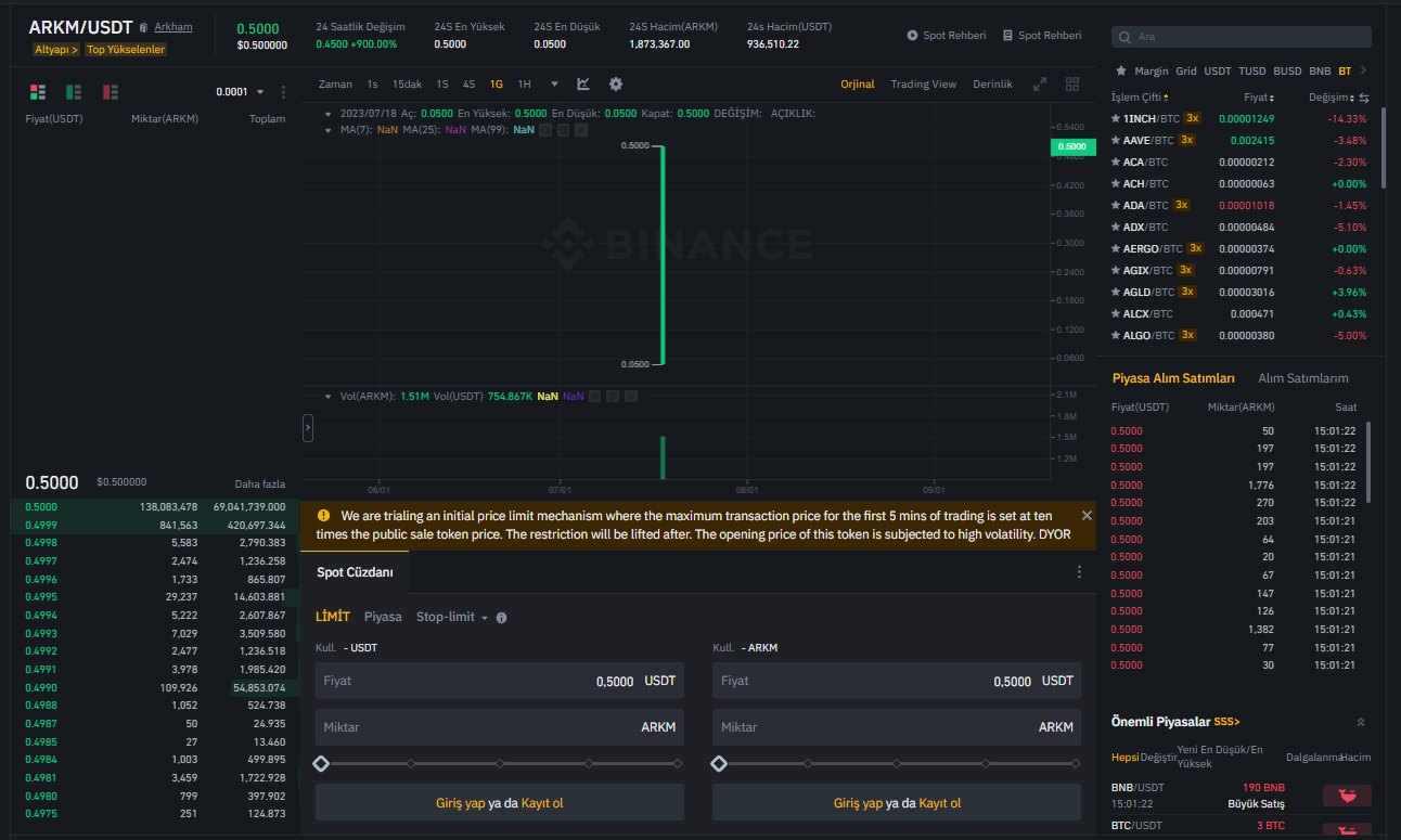 Şuan itibariyle ARKM’nin 0.05 dolardan 0.5 dolara yükseldiği görülüyor. Binance’in bu ön satışında 10 kat kuralı uygulaması, ARKM’nin 0.5 doları aşmasını engellemekte.