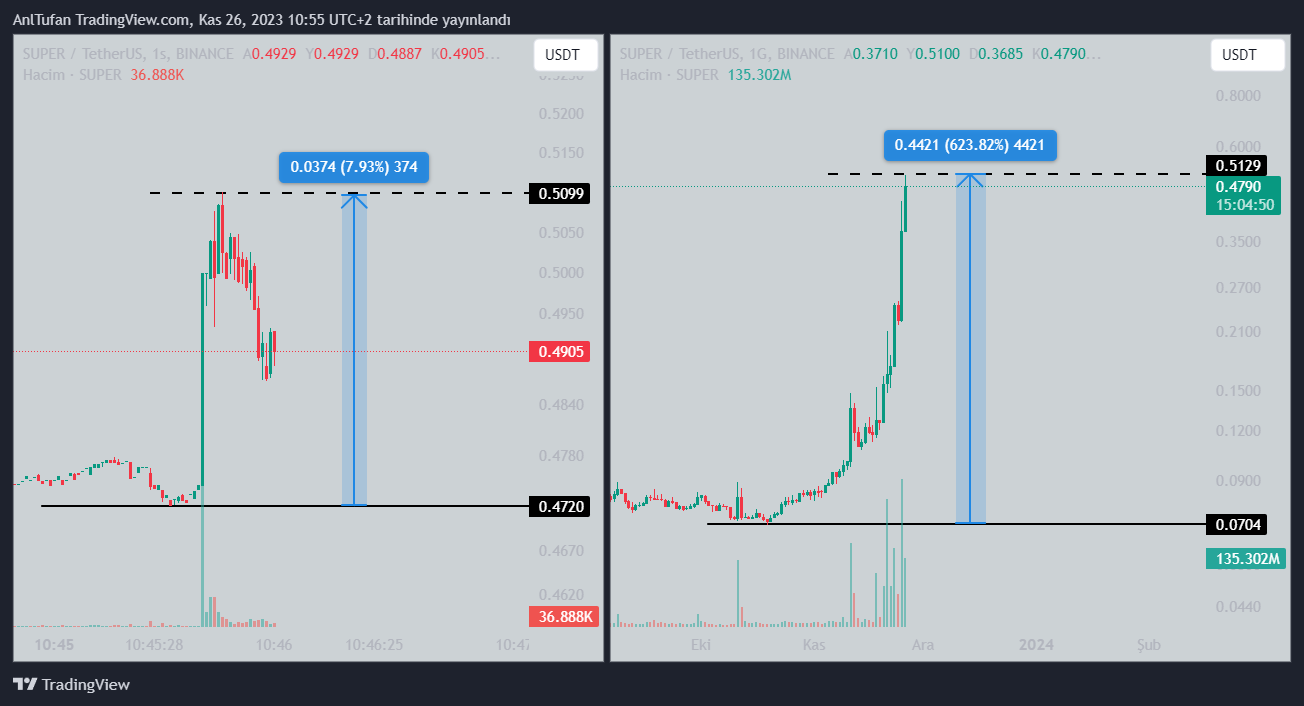 Çok kısa bir süre içerisinde %8’lik bir artış yaşayan SUPER, dikkatleri üzerine çekti. Bu altcoin son 1 ay içerisinde ise %600’lük bir yükseliş yaşayarak, değerini 7’ye katladı.