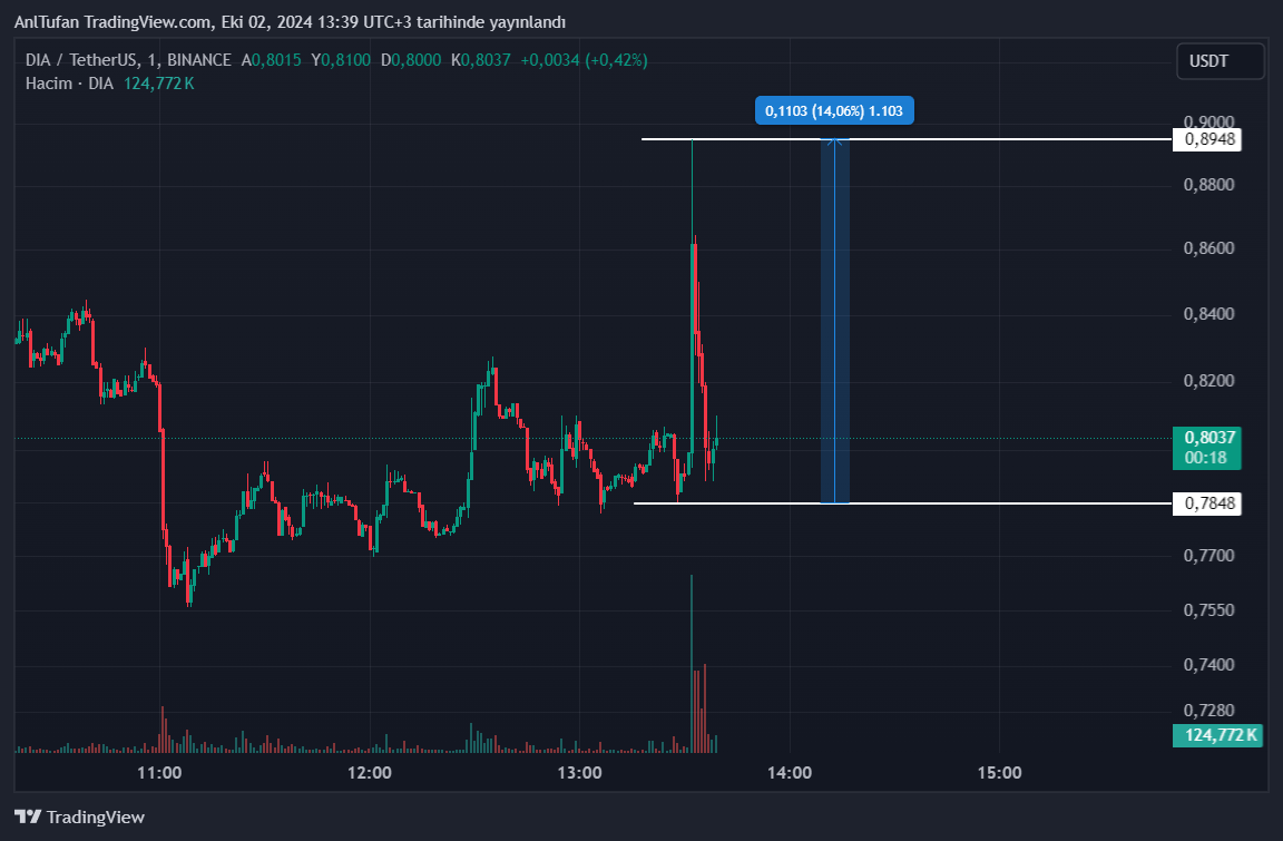 DIA isimli altcoin son dakikalarda gelen duyuru ile %14’lük ani bir sıçrama gerçekleştirdi. Bu sıçrama sonrasında ise düşüşe geçen DIA, dakikalar içerisinde tüm yükselişlerini kaybetti.