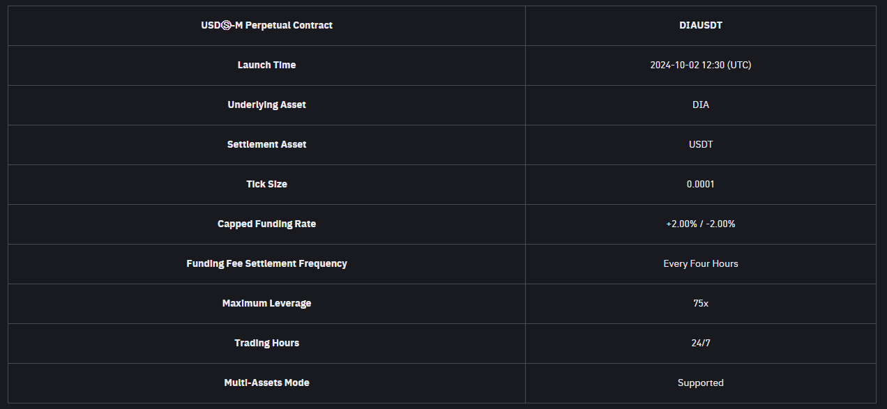 Popüler kripto para borsası Binance, DIA vadeli listeleme duyurusunda başlıca şu bilgileri aktardı: