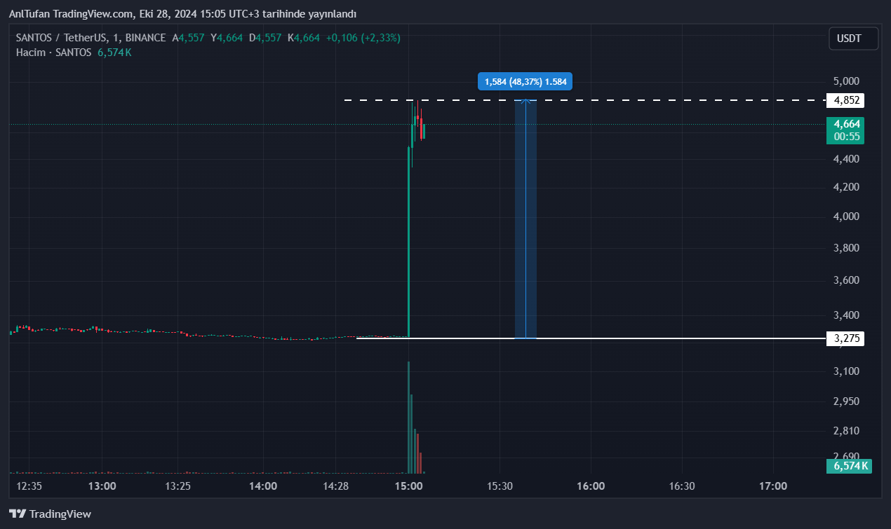 Bu son gelen vadeli listelemesi ile birlikte SANTOS isimli fan tokende de sert yükseliş yaşandı. Dakikalar içerisinde %50’lik bir yükseliş yaşayan SANTOS, yatırımcıların dikkatini çekti.
