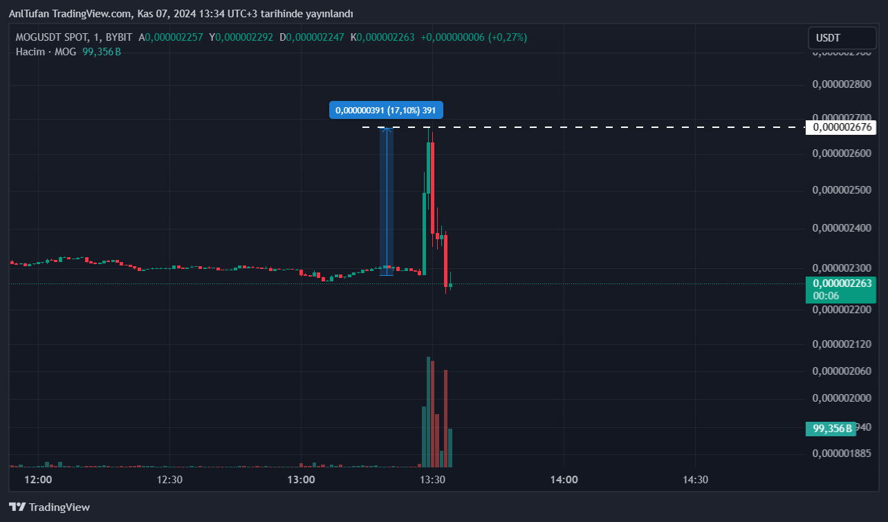 Binance’in vadeli listeleme duyurusu ile birlikte MOG fiyatında ani bir sıçrama yaşandı. Dakikalar içerisinde %17 oranında değer kazanmayı başaran MOG, sürecin ilerlemesiyle birlikte tüm yükselişlerini kaybetti.
