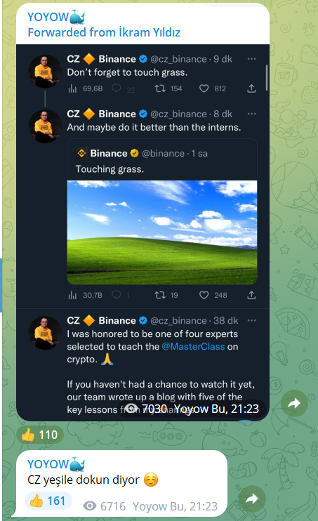 Geçtiğimiz dakikalarda Binance’in resmi Twitter hesabı üzerinden bir yeşillik görseli paylaşıldı. “Çimene dokunmak” başlığı ile paylaşılan bu görseli Binance CEO’su CZ’nin alıntıladığı görüldü.