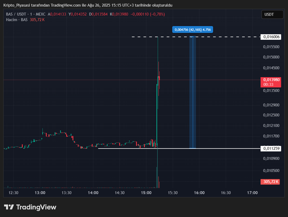 Bu listeleme haberi sonrasında ise BAS fiyatında ani bir yükselişin yaşandığı görüldü. BAS dakikaların ilerlemesiyle %50’ye yakın bir artış yaşayarak 0.0160 doları gördü.