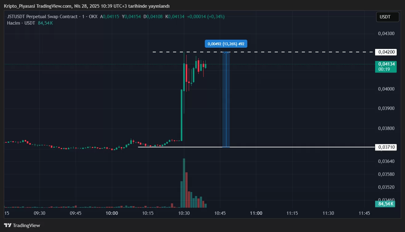 Hafta sonu itibariyle Tron kurucusu Justin Sun, JST fiyatının 100 katlık bir artış yaşayabileceğini söylemişti. Bu söylem sonrası JST’de yükseliş yaşanırken, son vadeli listelemesi de %13’lük bir artışı tetikledi.