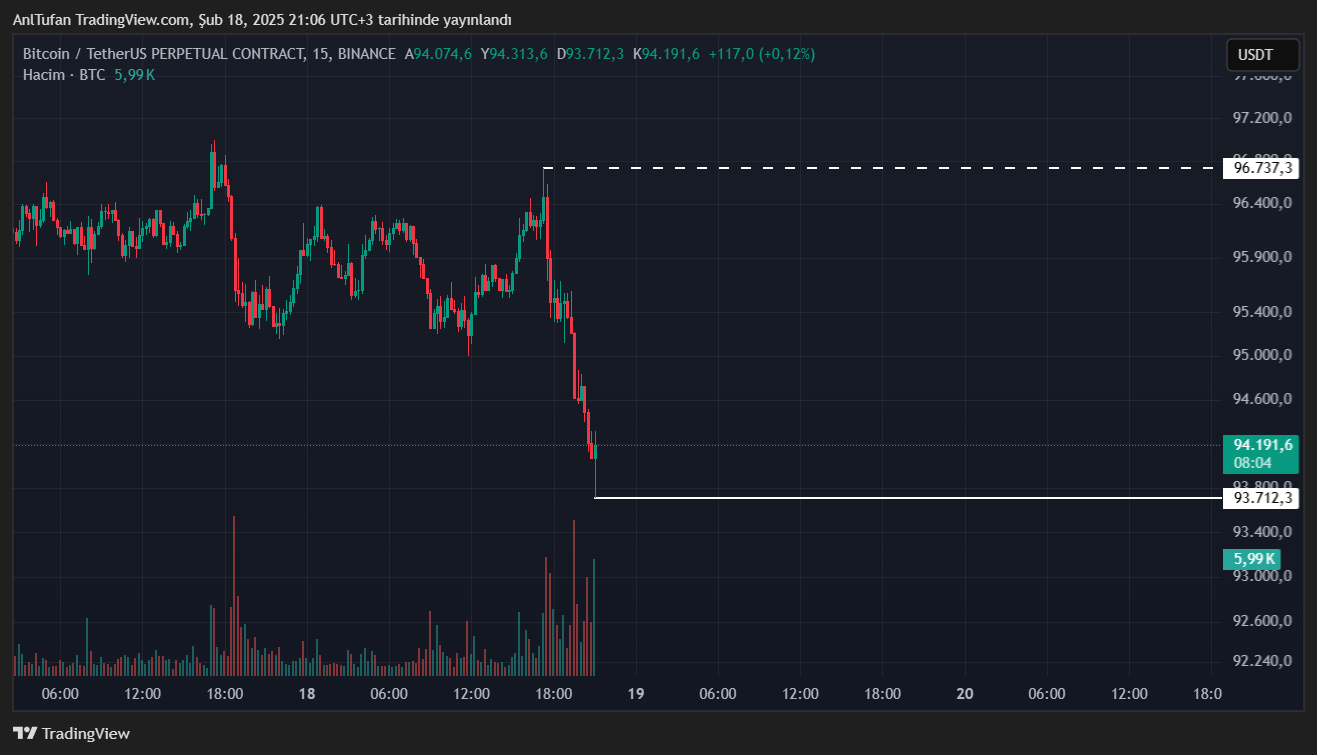Lider kripto para birimi Bitcoin (BTC) son yaşanan düşüşler ile birlikte 94 bin doların da altını gördü. TSİ 17.00’da 96.730 dolardan işlem gören BTC, satış baskısına yenik düşmüş durumda.