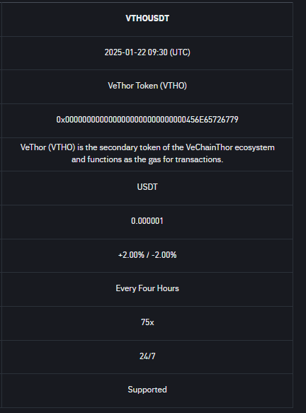 Son dakikalarda gelen bilgilere göre dev kripto para borsası Binance, VTHO isimli altcoin‘i vadeli piyasada listeleyecek. Dün itibariyle Upbit borsasının spot listelemesi ile birlikte devasa bir sıçrama yapan VTHO, şimdi ise 75 kata kadar kaldıraçla Binance vadeliye ekleniyor.