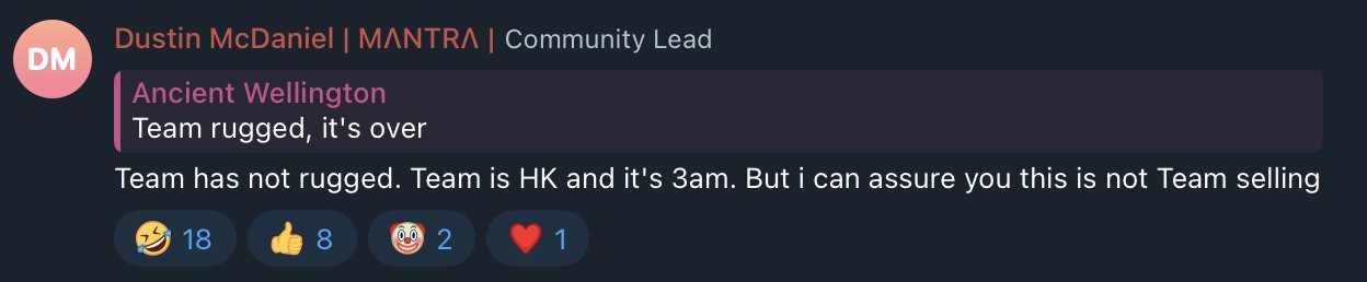 Her ne kadar birçok kripto para yatırımcısı ana MANTRA ekibinden bir açıklama bekliyor olsa da, ilk paylaşım Discord Topluluk Lideri Dustin McDaniel‘den geldi.