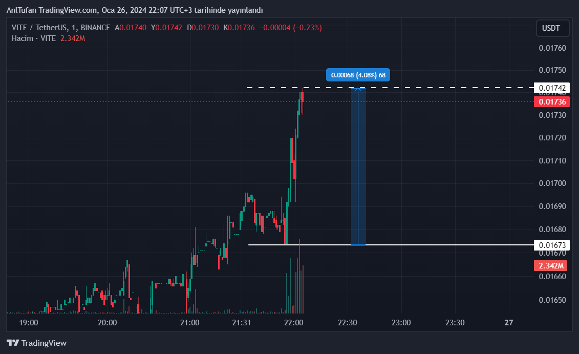 Şuan itibariyle VITE isimli altcoin’in bu paylaşım ile birlikte yukarı yönlü hareketler sergilemeye başladığı görüldü.