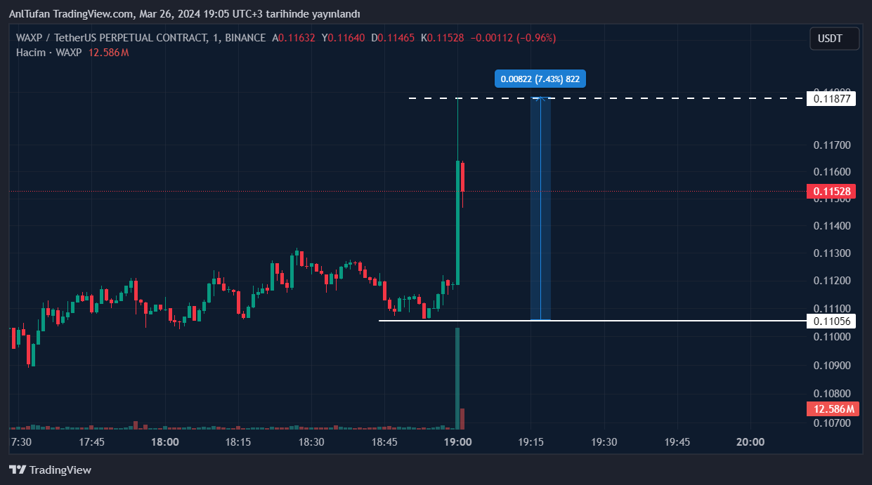 Bu son gelen duyuru ile birlikte WAXP fiyatı yükselişe geçti. Binance vadeli piyasada 0.110 dolardan 0.118 dolara yükselen WAXP, %10’a yakın bir sıçrama gerçekleştirdi.