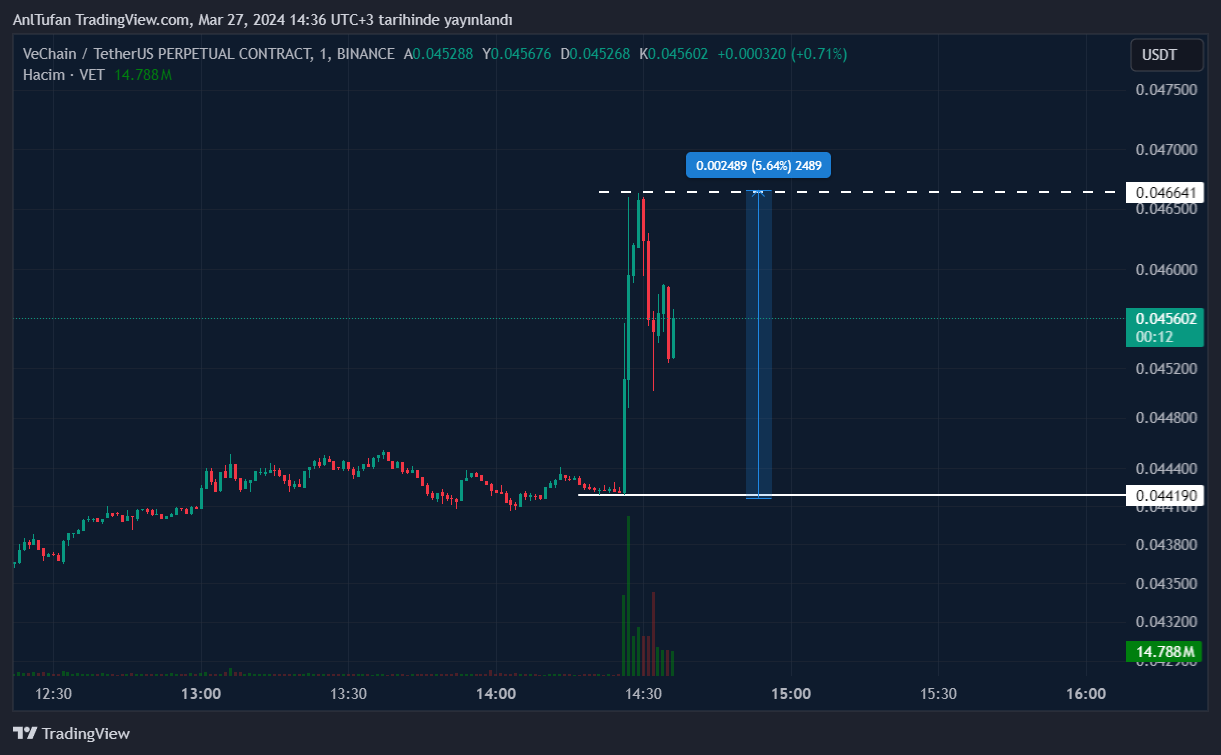 Bu gelişme ile birlikte VET fiyatının yukarı yönlü hareketler sergilediği gözlemlendi. Duyuru sonucunda 0.0466 dolar seviyelerine kadar %5’lik bir yükseliş yaşayan VET, dakikaların ilerlemesiyle bu yükselişlerin bir kısmını kaybetti.